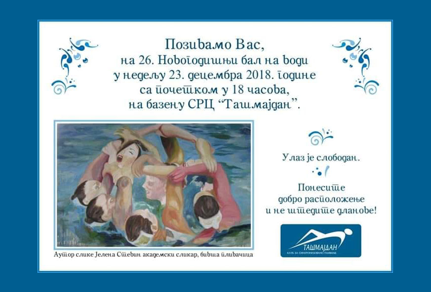 Позивамо Вас на 26. новогодишњи бал на води у недељу 23. децембра 2018. године са почетком у 18 часова на базену СРЦ Ташмајдан. Улаз је слободан!
