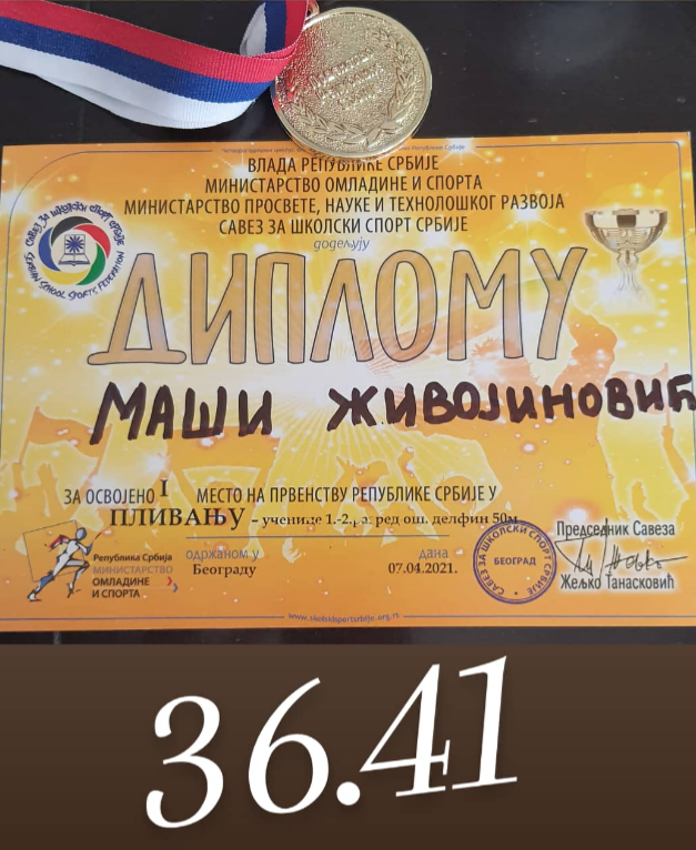 Сви су били срећни: и Маша, и медвед, и мама, и њена учитељица Снежана и настаник физичког Мирослав, који је био са њом на такмичењу, и другари… и сви који су сазнали да је Маша Живановић, ученица II / 4 разреда наше школе, победила и освојила златну медаљу у својој омиљеној техници пливања. Резултат од 36,41 секунде, који је постигла захваљујући тренерима ПК „Обилић“, изузетан је за њен узраст.