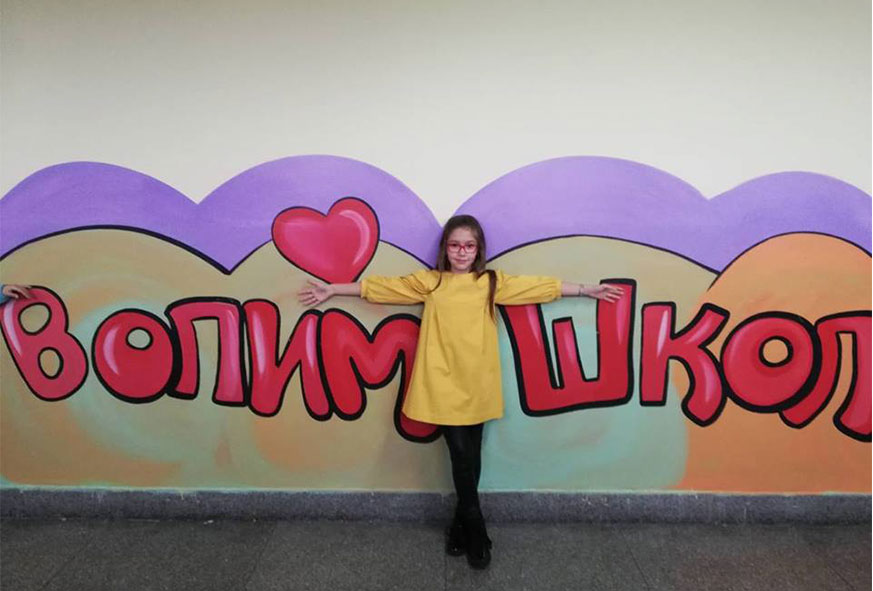 На зиду једног дугачког ходника пише „ВОЛИМ ШКОЛУ“.