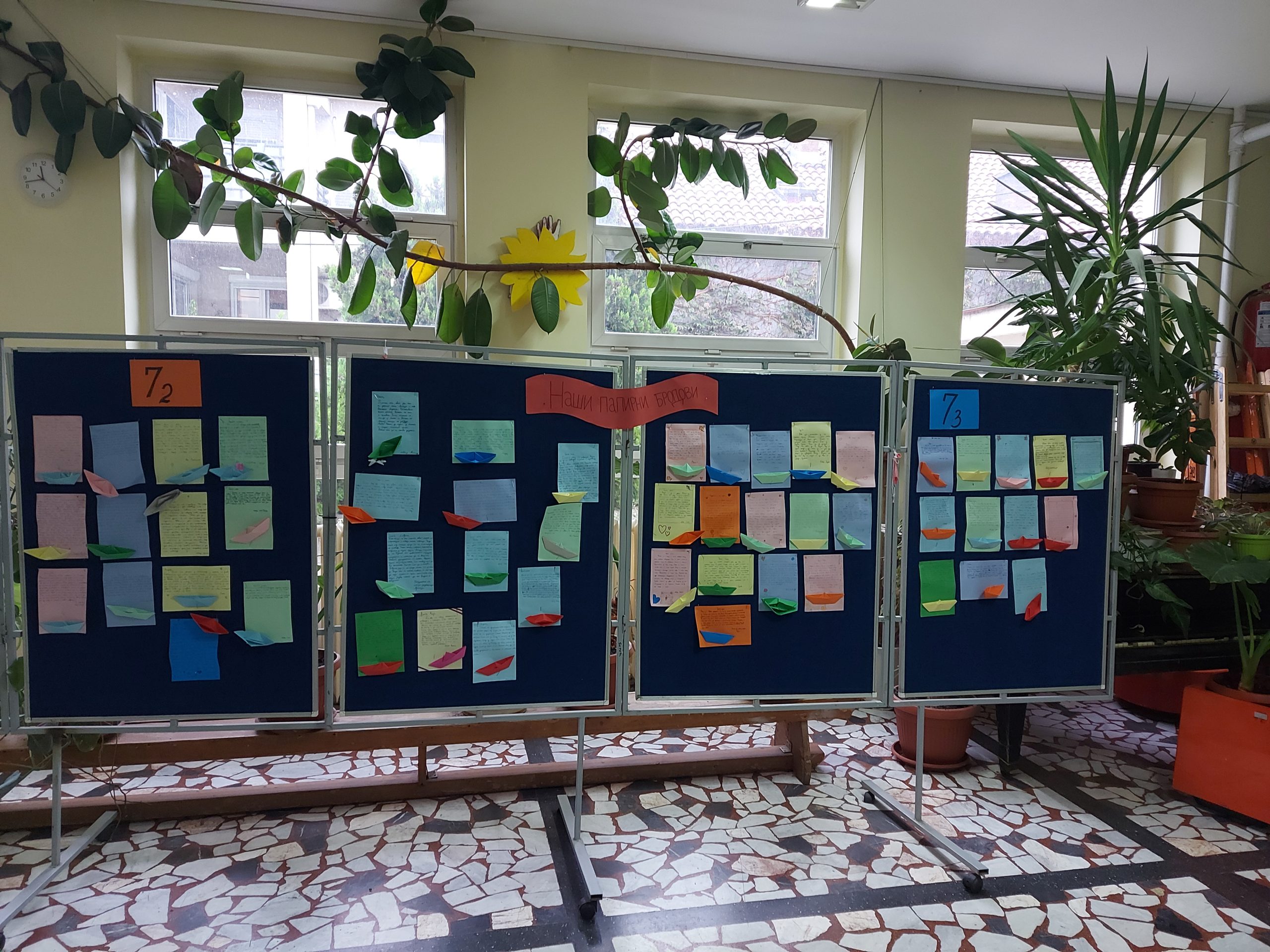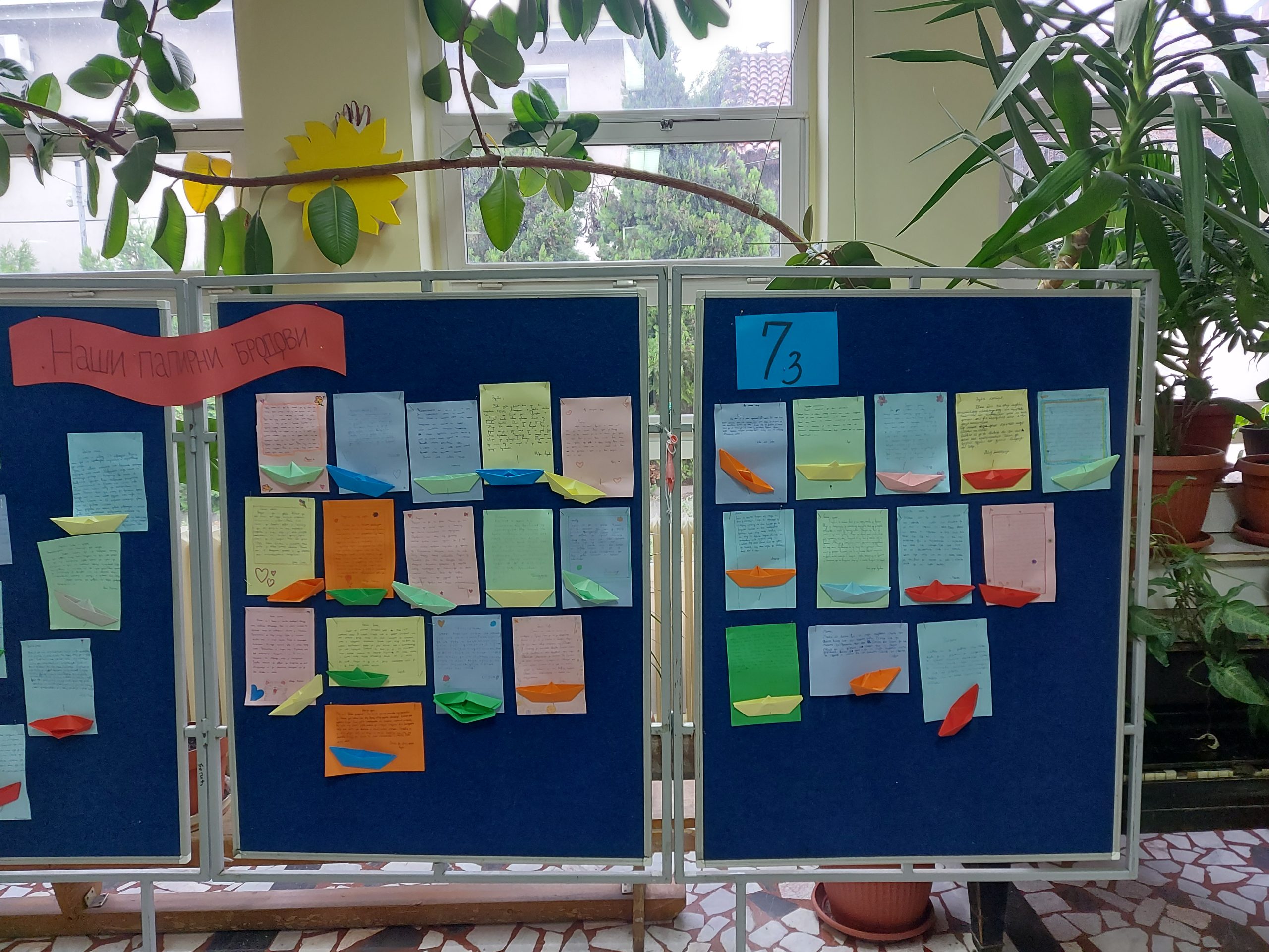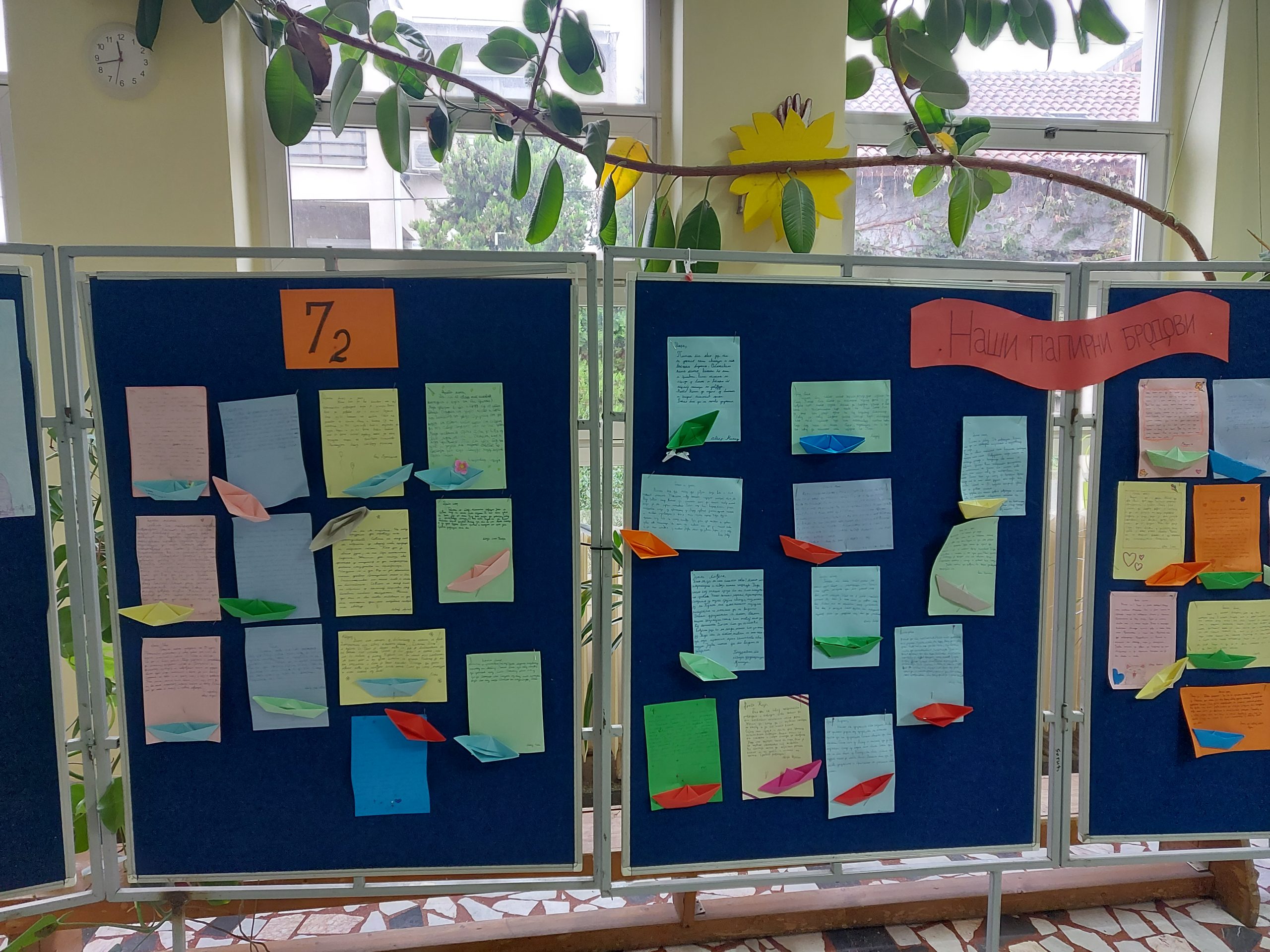 Ученици 7/2 и 7/3 реализовали су у оквиру пројектне наставе тему „Наши папирни бродови“. Пројекат је трајао две наставне недеље, односно четири школска часа, 9.9-20.9.2024. године. Најпре је на часу српског језика и књижевности анализирана песма индијског песника Рабиндраната Тагореа „Папирни бродови“. Како је у песми главни мотив ПОРУКА коју дечак свакодневно шаље непознатом налазачу правећи, украшавајући и пуштајући папирне бродове низ реку, ученици су на следећем часу писали поруке, али, за разлику од дечака из песме, блиској особи. Те поруке ученици су написали на шареним папирима (боје папира су сами бирали). Затим су ученици на наредном часу направили папирне бродове оригами техником (боју папира такође су сами бирали) и украсили их, уколико су то желели. Своје бродиће ученици су залепили уз своје поруке. Резултат њиховог рада представљен је на паноу у холу школе. Ученицима се свидео овакав начин рада, неки од њих су открили оригами, па су на интернету потражили како могу да направе и неке друге моделе од папира. Реакције ученика других одељења и разреда, наставника и родитеља, такође су позитивне. Они прилазе паноу и читају радове својих другарица и другова, односно ученика, те међусобно коментаришу. Ученици 7/2 и 7/3 показали су заинтересованост за учествовање у целокупној пројектној настави, примењујући своја знања из граматике, правописа, теорије књижевности, тумачења књижевног дела, функционалне употребе стилских фигура, ликовне културе… Овај пројекат биће уједно и наш допринос обележавању Дечје недеље.