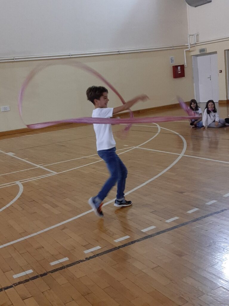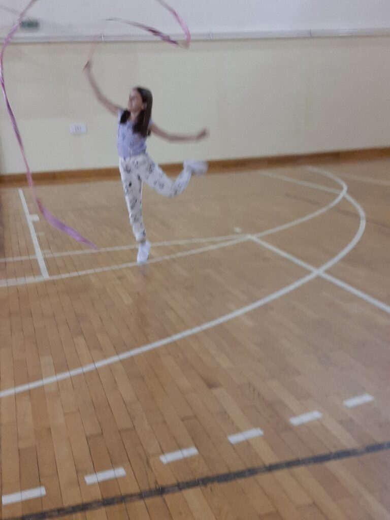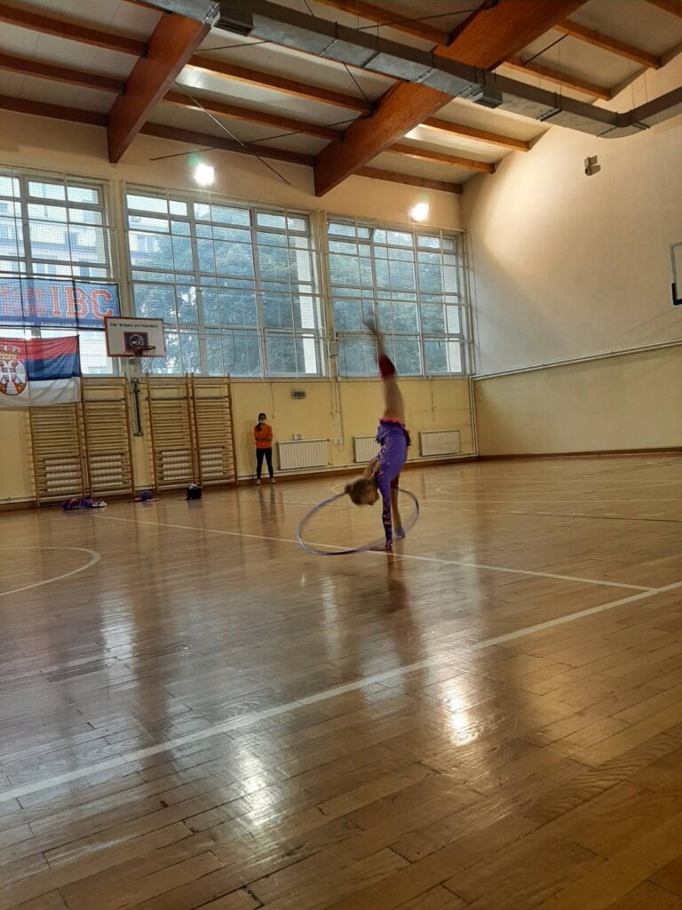 Уз дивне звуке музике гимнастичарка извела вежбе вијачом, чуњевима и обручем. Ученици тренеру и гимнастичарки постављали питања о ритмичко – спортској гимнастици, правилима, начину извођења вежби појединим реквизитима, усклађивању тренинга са школом, начину исхране, издржљивости…